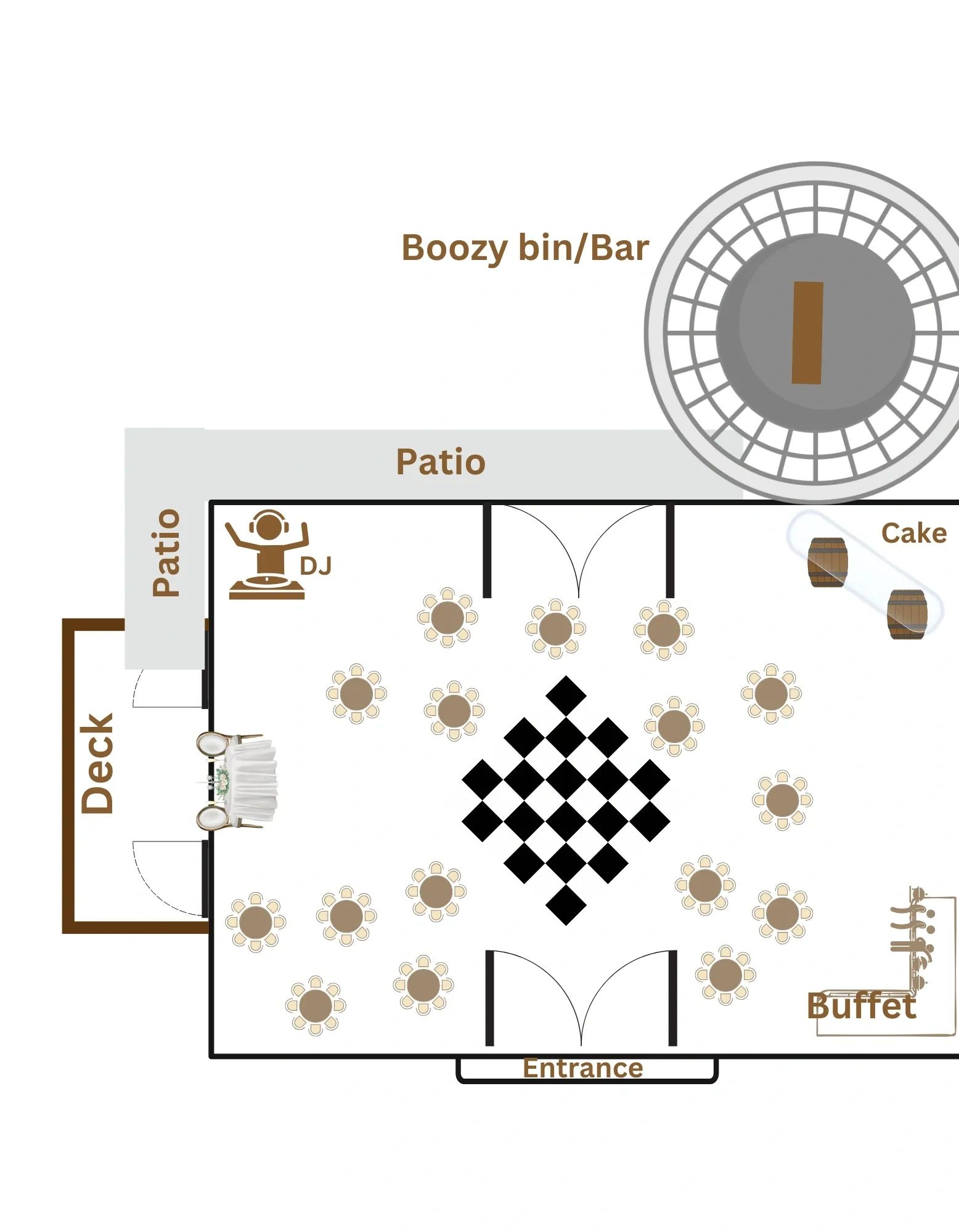 This is a sample of one of our floor plans. We have additional tables and chairs to accomodate more that can be added or simply removed for a lesser headcount. As well as we offer the ability to move things around a bit, just ask u